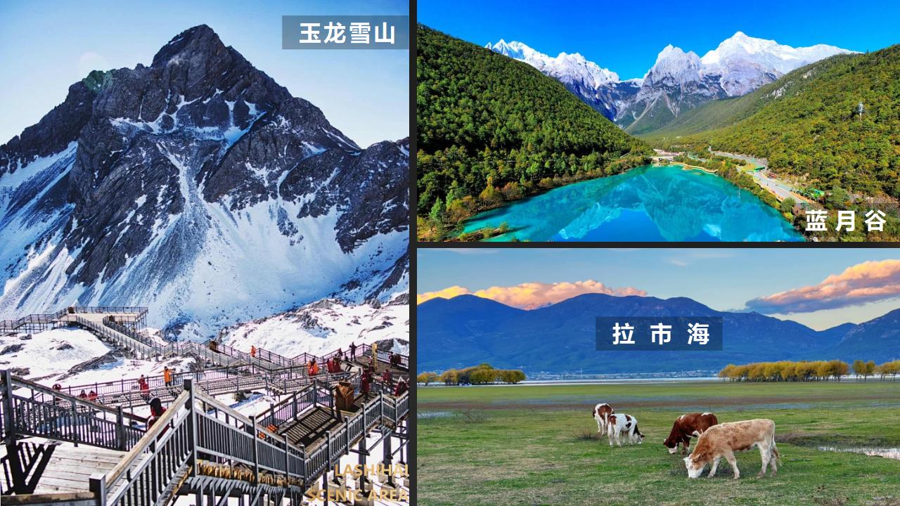 酒店早餐后,前往游览中国最有特色的古镇-【束河古镇】,束河古镇是茶马古道上保存完好的重要集镇,也是纳西先民从农耕文明向商业文明过渡的活标本、对外开放和马帮活动形成的集镇建设典范。午餐后前往纳西族人神圣的山峰,长江以南的第一高峰,国家5A级景区【玉龙雪山】,延绵数十里的玉 龙十三峰,在碧蓝天幕的映衬下,宛如银色巨龙在作永恒的飞舞。乘索道上“玉龙第三国”—【冰川大索道】(温馨提醒:如遇黄金周或旺季玉龙雪山大索道流量限制,我们将为您更改为云杉坪索道,并现退差价),欣赏著名的纳西爱情圣地。雪山森林、雪山草甸将整个玉龙雪山装点得层次分明、色彩旖旎,尽情感受您的激情雪山之旅。三面环山的天然牧场!