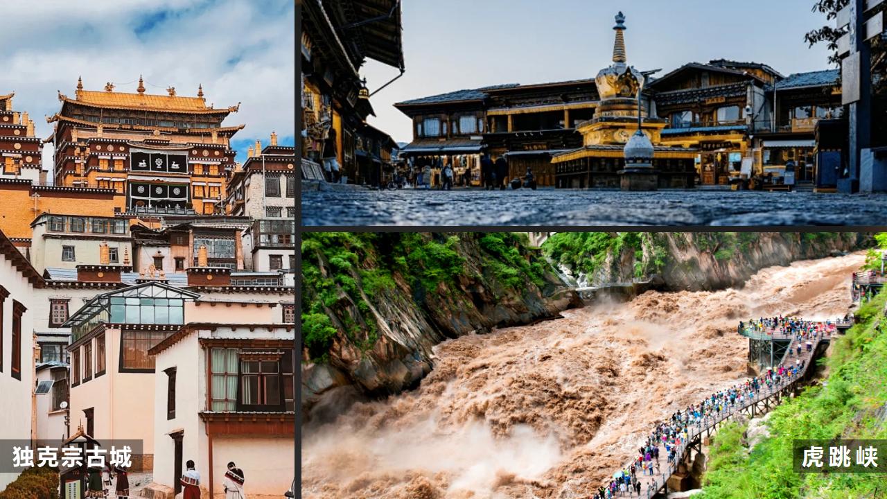 【香巴拉时轮坛城文化博物馆】是藏区最大活佛班禅大师的道场,道场内供奉有一座金碧辉煌,嵌满藏密七宝(天珠、蜜蜡、绿松石、红珊瑚、珍珠、玛瑙、砗磲)的世界最大、装藏最多的黄金立体坛城,是由班禅大师亲自开光加持并赐名。景区目前开放藏地瑰宝、多彩香巴拉、雪域印象、香格里拉邓展馆,分别从自然风光、人文生活、历史渊源到宗教艺术,以不同视角展现多样的藏文化。【虎跳峡】从虎跳峡镇过冲江河,沿哈巴雪山山麓顺江而下,即可进入峡谷。【上虎跳】距虎跳峡镇9公里,是整个峡谷中最窄的一段,江心有一个13米高的大石-【虎跳石】,巨石犹如孤峰突起,屹然独尊,江流与巨石相互搏击,山轰谷鸣,气势非凡,被国家地理杂志社评为中国最美的十大峡谷。晚上抵达丽江晚餐自行解决。