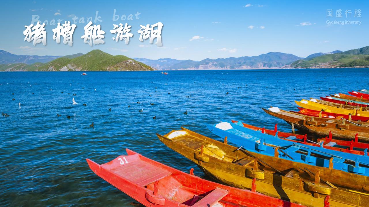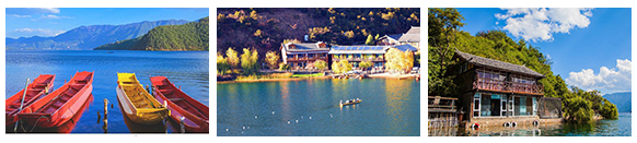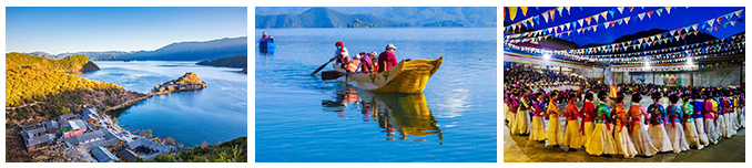 早餐后乘猪槽船登里务比岛(里务比岛是湖中五个全岛中面积最大,植被最好的一个。里务比岛上的寺庙属黄教喇嘛寺,始建于公元1634年。20世纪60年代初因众所周知的原因,作为封建迷信的产物被毁坏。1989年在罗桑益世活佛的倡导下,政府出资,群众投工投劳,由县旅游局具体负责实施重建,于1990年12月竣工。寺里供奉的佛像、法器都是当地信教群众自愿集资供奉的),中午乘车返回丽江,宁蒗县城用中餐,返回丽江,晚乘火车卧铺专列至昆明。