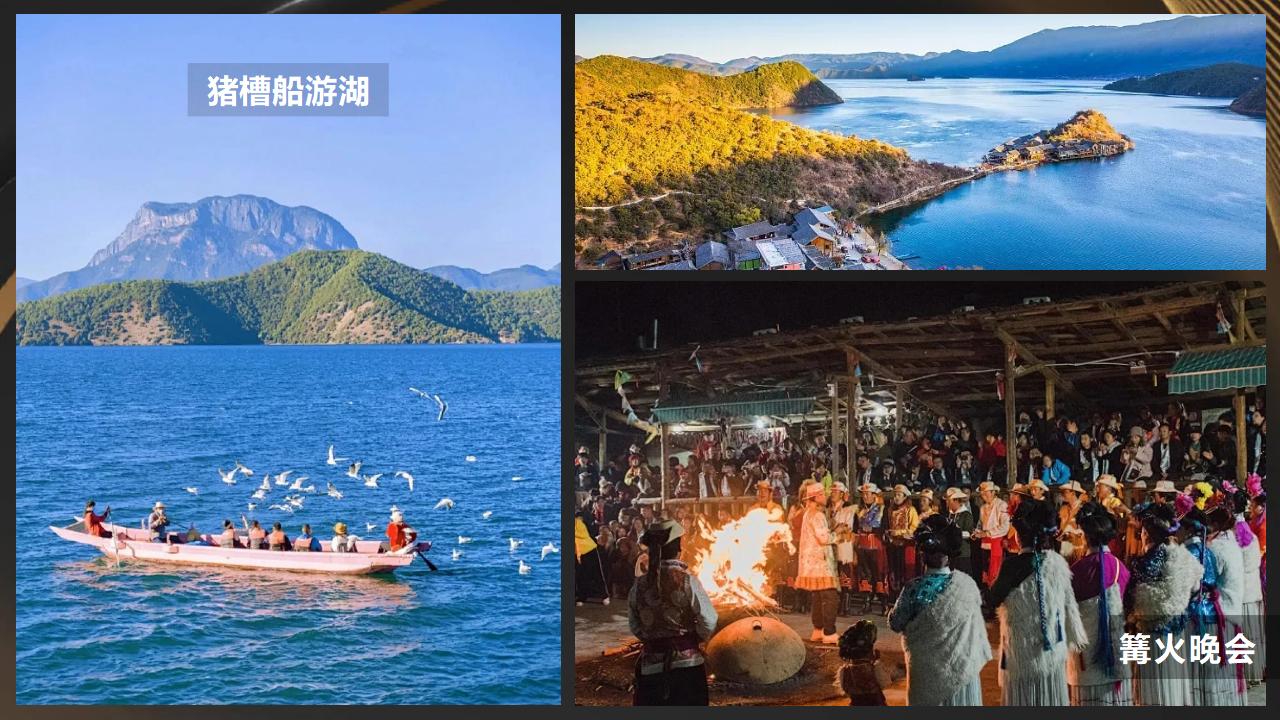 早餐后乘猪槽船登里务比岛(里务比岛是湖中五个全岛中面积最大,植被最好的一个。里务比岛上的寺庙属黄教喇嘛寺,始建于公元1634年。20世纪60年代初因众所周知的原因,作为封建迷信的产物被毁坏。1989年在罗桑益世活佛的倡导下,政府出资,群众投工投劳,由县旅游局具体负责实施重建,于1990年12月竣工。寺里供奉的佛像、法器都是当地信教群众自愿集资供奉的),乘车返回丽江,宁蒗县城用中餐,返回丽江,晚乘火车卧铺专列至昆明。