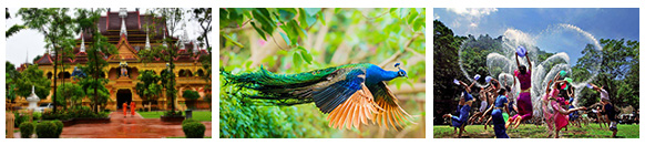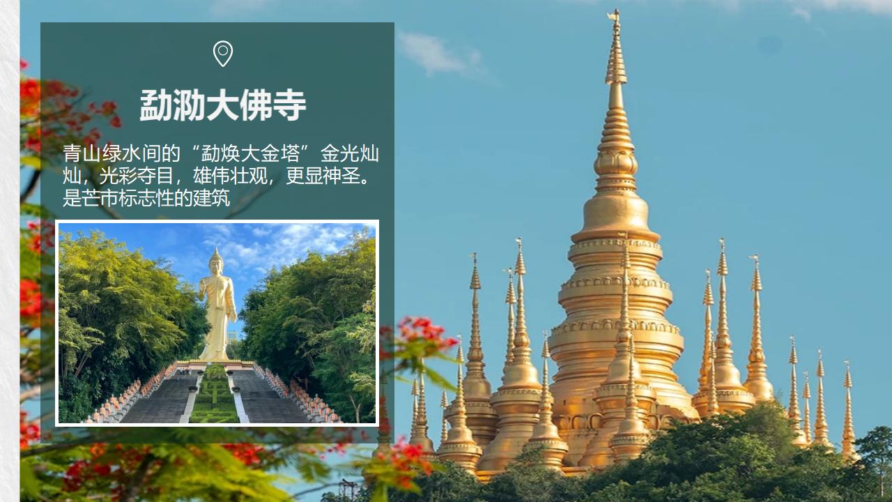 中餐品尝当地特色傣族风味餐,参观前往享誉东南亚的南传佛教标志建筑【勐泐大佛寺】(不含电瓶车40元/人)这里佛像高49米,站在佛脚可以将整个景洪城尽收眼底,参加泼水活动,感受傣族节日的狂欢、体验傣族孔雀放飞的盛况。乘车前往晚上自费参加【篝火晚会】或【湄公河游轮】(费用280元/人自理)。晚上入住酒店