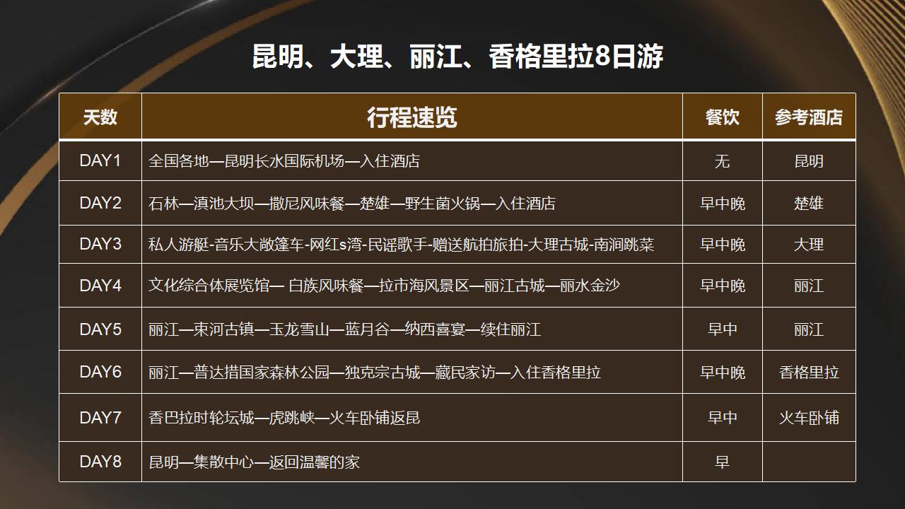 【香巴拉时轮坛城文化博物馆】是藏区最大活佛班禅大师的道场,道场内供奉有一座金碧辉煌,嵌满藏密七宝(天珠、蜜蜡、绿松石、红珊瑚、珍珠、玛瑙、砗磲)的世界最大、装藏最多的黄金立体坛城,是由班禅大师亲自开光加持并赐名。景区目前开放藏地瑰宝、多彩香巴拉、雪域印象、香格里拉邓展馆,分别从自然风光、人文生活、历史渊源到宗教艺术,以不同视角展现多样的藏文化。【虎跳峡】从虎跳峡镇过冲江河,沿哈巴雪山山麓顺江而下,即可进入峡谷。【上虎跳】距虎跳峡镇9公里,是整个峡谷中最窄的一段,江心有一个13米高的大石-【虎跳石】,巨石犹如孤峰突起,屹然独尊,江流与巨石相互搏击,山轰谷鸣,气势非凡,被国家地理杂志社评为中国最美的十大峡谷。晚上抵达昆明晚餐自行解决。