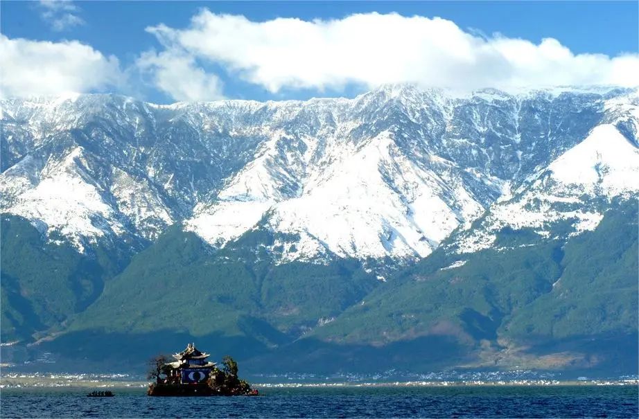 在北纬 25 度的地方是很难看到积雪的,但苍山雪不仅经冬不消,到了阳春三月,雪线以上仍是银装素裹。而最高峰马龙峰的积雪更是终年不化,即便盛夏时节,山间的浓绿与山顶的洁白,构成奇妙的对比。
