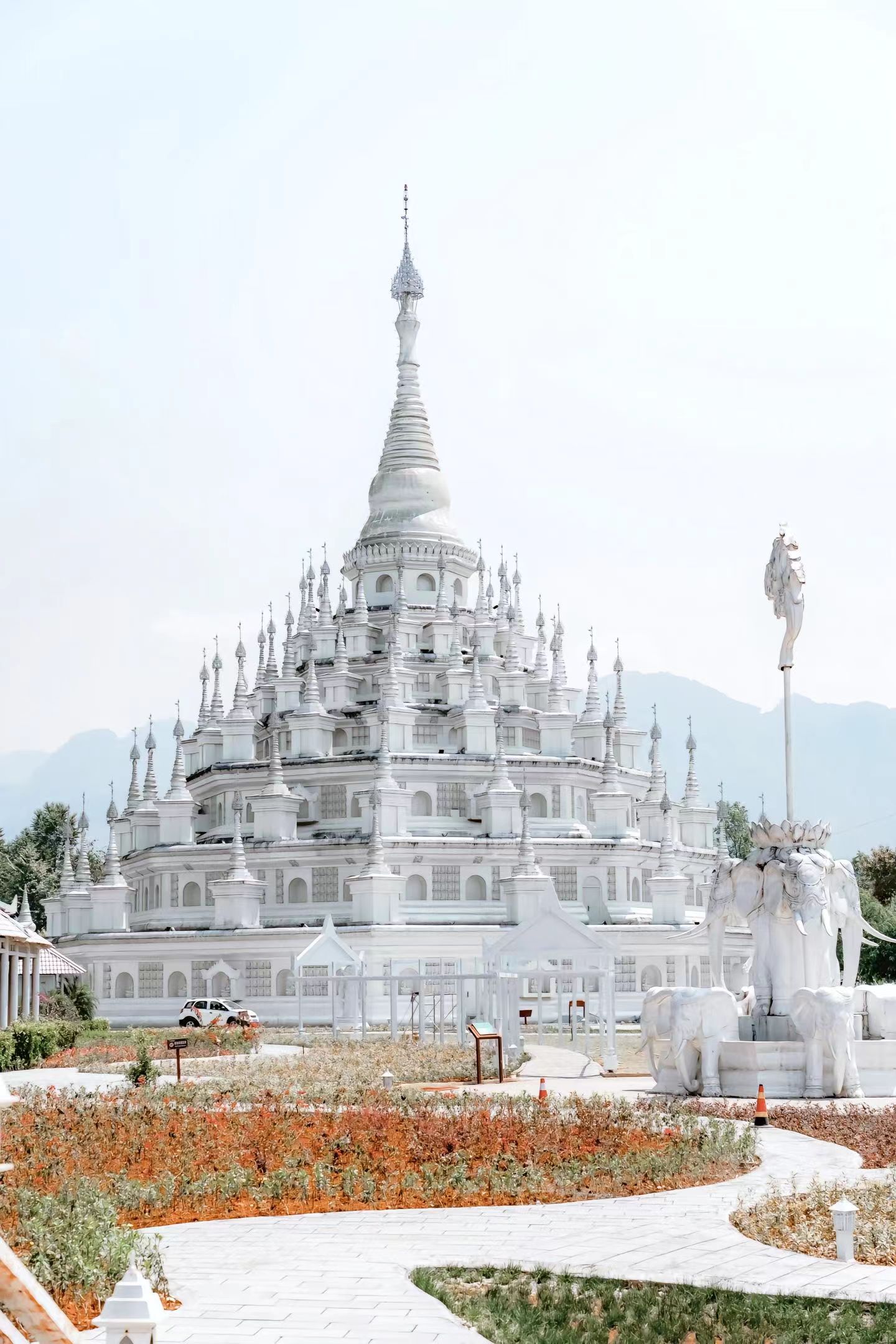 与金塔相毗邻的勐焕银塔,塔身纯白,圣洁庄严,是世界上最大的小乘佛教万佛塔。