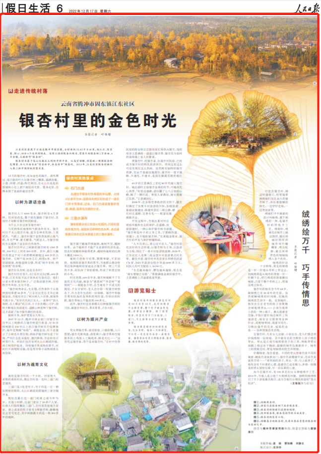 12月17日,《人民日报》假日生活版整版刊文《云南省腾冲市固东镇江东社区:银杏村里的金色时光》,聚焦云南保山腾冲市固东镇江东社区的美好生活。全文如下: