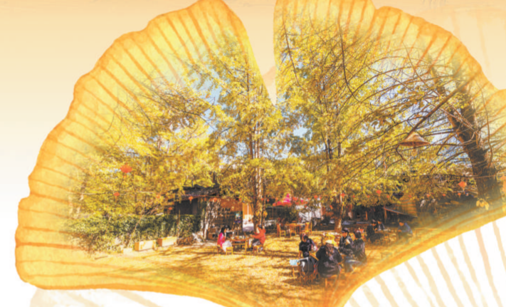 游客们在银杏树下品尝银杏宴